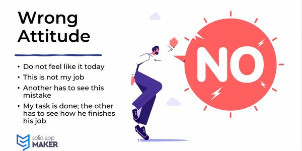 A wrong attitude undermines our collective efforts, characterized by sentiments like "I don't feel like it today," "This is not my job," "My task is done," and "Others should finish their job." Such perspectives erode team cohesion, accountability, and shared responsibility, hindering our journey towards achieving unified success.